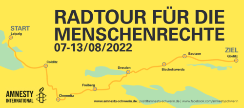 Jedes Jahr organisieren engagierte Amnesty-Mitglieder eine Radtour für die Menschenrechte, um sportlichen Aktivismus und Menschenrechtsaktivismus zu verbinden. Dieses Jahr führt die Radtour quer durch Sachsen und macht vom 07. bis zum 14. August 2022 in insgesamt acht sächsischen Städten Halt. Kommt an den Stationen ins Gespräch, informiert Euch über Einzelschicksale und unterstützt mit Eurer Unterschrift, um den weltweiten Druck auf die verantwortlichen Regierungen zu erhöhen!
