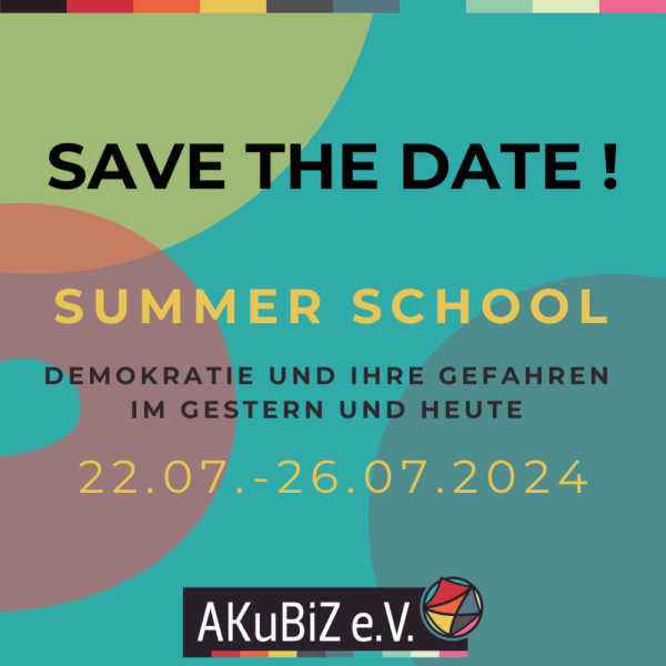 WeiterlesenDer AKuBiZ e.V. veranstaltet vom 22.07. bis 26.07.2024 eine Summer School in Pirna. Die Summer School ist kostenfrei und richtet sich an junge Menschen zwischen 12 und 20 Jahren. Eine ganze Woche lang erwarten die Teilnehmer_innen Inputs und Workshops rund um die Themen Demokratie und demokratischer/antifaschistischer Aktivismus in Geschichte und Gegenwart, erkennen von demokratie- und menschenfeindlichen Einstellungen und mit welchen Handlungsstrategien man diesen begegnen kann – und einiges mehr!