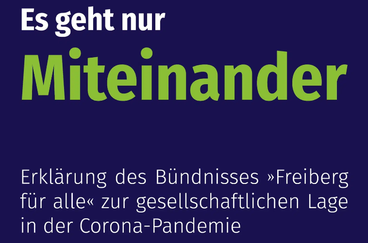WeiterlesenDie Initiative „Freiberg für Alle“ appelliert an alle Akteure, die gesellschaftlichen Herausforderungen der Pandemie gemeinsam und solidarisch zu bewältigen: „[…] Wir leben in einer Demokratie, für die der zivilisierte parlamentarische und gesellschaftliche Meinungsstreit nicht nur zulässig, sondern notwendig ist. Daher ist die sachliche Auseinandersetzung über die Notwendigkeit, Angemessenheit und Verhältnismäßigkeit der Maßnahmen dringend erforderlich. Auf dem Weg zu einem möglichst breiten gesellschaftlichen Konsens helfen Hass und ausgrenzende Ideologien, Verschwörungserzählungen oder Gewalt genauso wenig weiter, wie Pauschalverurteilungen und Diffamierungen von Andersdenkenden. Eine große Herausforderung der Corona-Pandemie liegt noch vor uns: Als Gesellschaft müssen wir es schaffen, wieder ins Gespräch zu kommen und verhärtete Positionen aufzuweichen, damit wir gemeinsam nach vorne schauen und den Weg aus der Krise finden können. Diese Pandemie zu überwinden, ist ein gigantischer Kraftakt der Gesellschaft, zu dem jede und jeder Einzelne einen Beitrag leisten muss. Es geht nur miteinander.“