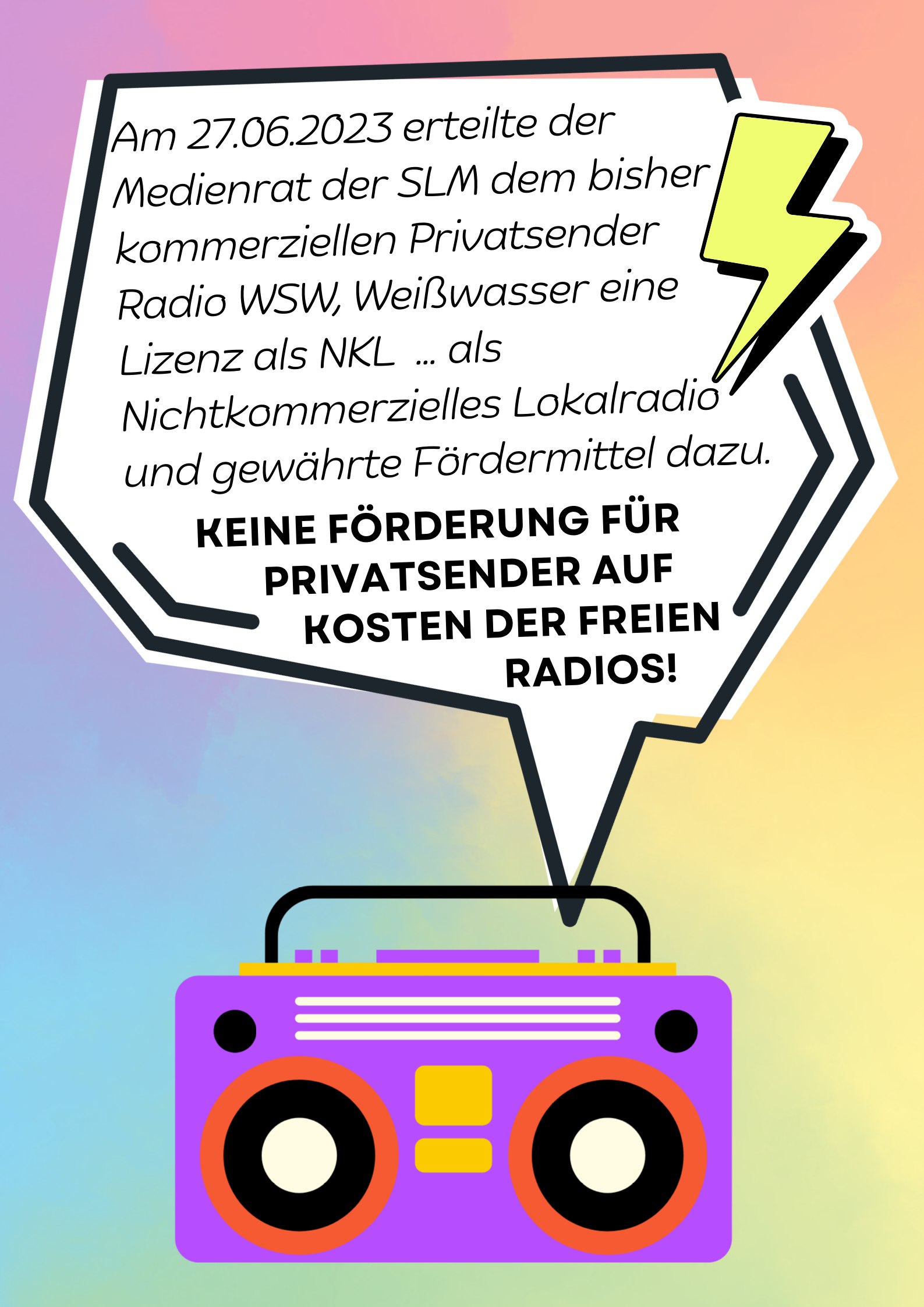 Die Meinungsvielfalt in Sachsen ist massiv bedroht. Trotz gestiegener Aktivitäten und stetig wachsenden Kooperations- und Mitmach-Anfragen aus der Zivilgesellschaft, ist im Moment komplett unklar, ob und wie viele Mittel für Koordinationsstellen die freien Radios in den kommenden Jahren erhalten können. Bereits ab Oktober 2023 sind diese bei Radio Blau und ColoRadio nicht mehr finanziert, Anträge für 2024 werden gerade gestellt. Die Fördermittel sollen nach aktuellem Stand aber auf zukünftig immer mehr, auch zu großen Konzernen gehörende Radiosender aufgeteilt werden, unabhängig davon, welchen inhaltlichen Beitrag sie tatsächlich für Medienvielfalt und Medienkompetenz in Sachsen leisten.