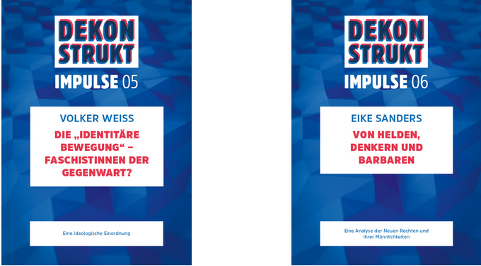 Das Hamburger Projekt „Dekonstrukt“ entwickelt pädagogische Handlungsmöglichkeiten und informiert zu Fragestellungen, Zugängen und Distanzierungsarbeit im Feld der „Neuen Rechten“, u.a. den Impuls „Die „Identitäre Bewegung“ – FaschistInnen der Gegenwart?“ von Volker Weiss. Aber auch alle anderen Impulse der Reihe sind sehr empfehlenswert!