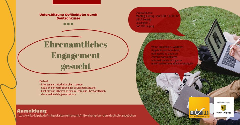 WeiterlesenDu willst dich ehrenamtlich engagieren? Du hast Interesse an interkulturellem Austausch und Lernen? Du fühlst dich in der Lage, die deutsche Sprache auf leichtem und einfachen Niveau zu vermitteln? Dann engagier dich bei der VILLA Leipzig! Vorkenntnisse sind nicht notwendig.