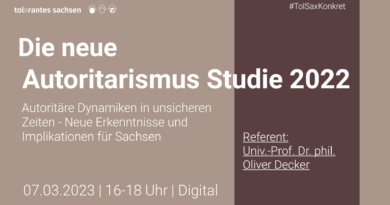 Es erwarten Sie spannende Vorträge und Diskussionen mit Gästen aus Sachsen und Berlin/ Brandenburg. Außerdem Workshops zur gemeinsamen Erarbeitung einer Strategie für Sachsen, als Ausgangspunkt für eine aktive Entwicklung demokratischer Kultur in Zukunft in Sachsen. Weitere Informationen entnehmen Sie bitte dem Flyer.