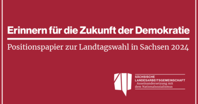 Die sächsische Landesarbeitsgemeinschaft Auseinandersetzung mit dem Nationalsozialismus (sLAG) schlägt die Verabschiedung eines erinnerungspolitischen Gesamtkonzepts für Sachsen vor. Die Idee beruht im Wesentlichen auf zwei Befunden: Zum einen birgt die angespannte Haushaltslage des Freistaats die Gefahr, dass lang gewachsene Strukturen der politisch-historischen Bildung erodieren und relevante Themen aus dem Fokus geraten oder zur Debatte stehen. Zum anderen ist die Erinnerungskultur mit ihrem Wirken gemäß einer gelebten Demokratie mehr denn je ein umkämpftes, vom Geschichtsrevisionismus bedrohtes Feld.